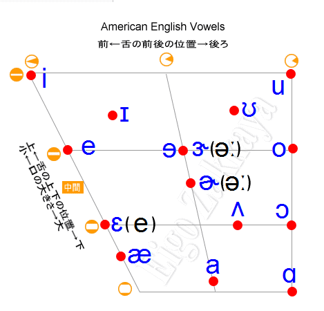 アメリカ英語の母音を口の大きさと舌の位置を軸にマッピングすると下図のようになります。