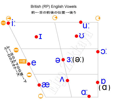 イギリス英語の母音を口の大きさと舌の位置を軸にマッピングすると下図のようになります。