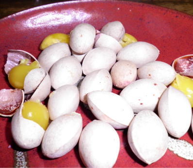 (Photo: Ginnan nuts; some of them with the shell cracked.)