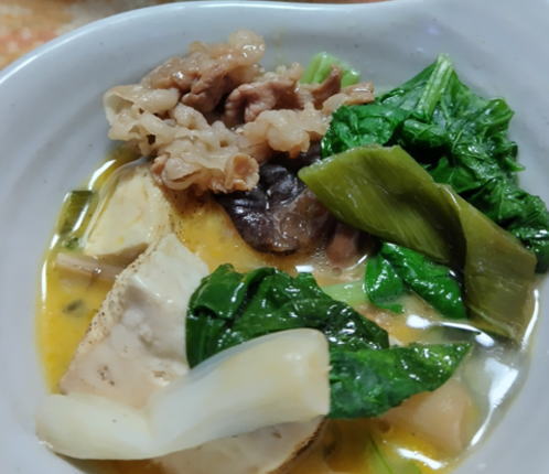 Home-made Sukiyaki with Nano Hana or salad flower instead of Shun Giku.