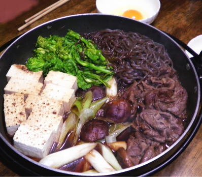 As one of Nabe Ryōri (pot cuisine), it's for collective eating and a typical item for Bōnen Kai (Year Closing Party) or Shinnen Kai (New Year Welcoming Party). While people are chatting over drinks picking up some small Otsumami (side dish), a voluntary cooking hero (called Nabe Bugyō or Pot Governor) will start to grill beef slices, season them with sugar and Shōyu, put other ingredients such as Tōfu, Neghi (Welsh onion), Konnyaku, Fu, Shun Ghiku (vegetable chrysanthemum), Maronī (a kind of glass noodle) and Mochi (rice cake) in an appropriate sequence (Pot Governor can be very specific about this!). When the governor gives a green light, it's done and time to eat. Usually, ingredients are dipped in stirred raw egg, which makes the taste richer. Since eating is from the same pan, slow eaters should be a bit warned: Make haste or take whatever you want before gobblers do! Lastly, when most of the contents in the pan are gone, here comes Udon (a type of noodle). Your Bugyō will order more broth (for no extra charge) and start cooking again.
